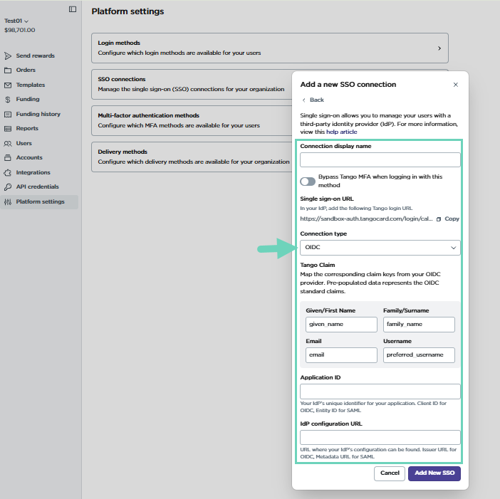 Connection type: Select the protocol used for SSO: OIDC or SAML.