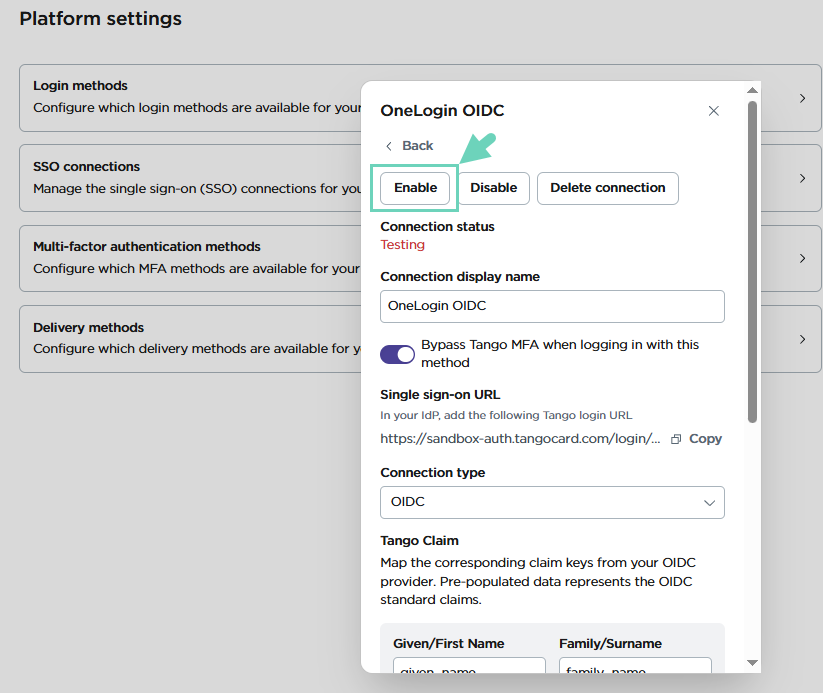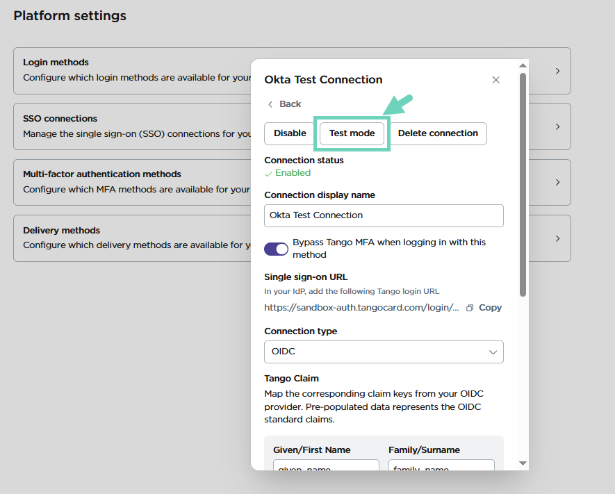 As a Tango portal admin, you should test your SSO connection before enabling it for other users. To test the SSO connection, change it to the testing mode. When the test is successful, enable the connection to make the SSO available for all users on the Tango portal.