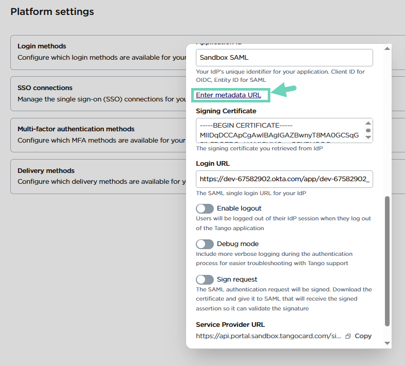Once the SSO entry has been created in your IdP, copy the required values in IdP for Tango portal configuration.