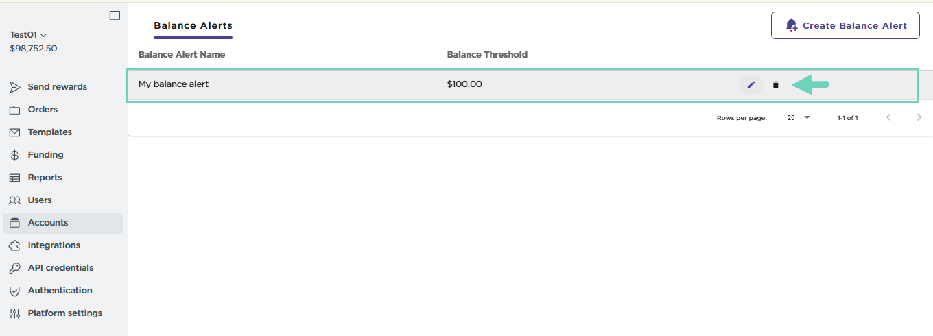 Click Delete next to the balance alert to stop notifications and delete all configured settings. Deleting an alert does not affect the account itself or its balance—it only removes the monitoring feature.
