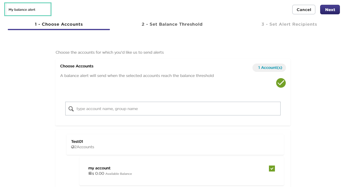 Choose Accounts—lets you pick specific account(s) to send alerts when their balance reaches the threshold.