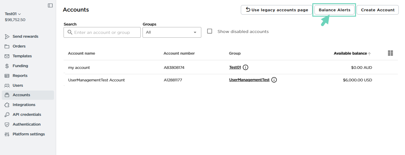 Select Balance Alerts > Create Balance Alert