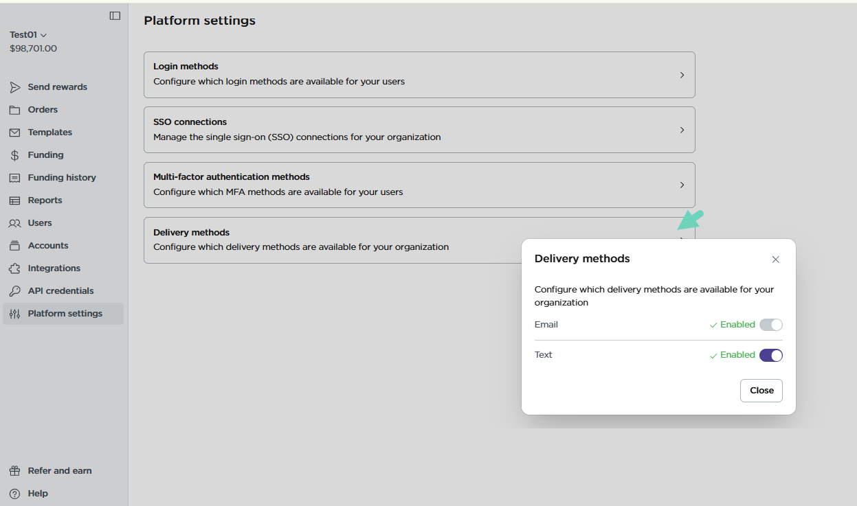 - Select the checkbox to Agree, then click Enable. The text delivery is now enabled for your platform. You can toggle text delivery off and on from this menu without signing the addendum again. When enabled, it allows rewards to be sent to the recipients phone numbers. See Manage delivery methods.