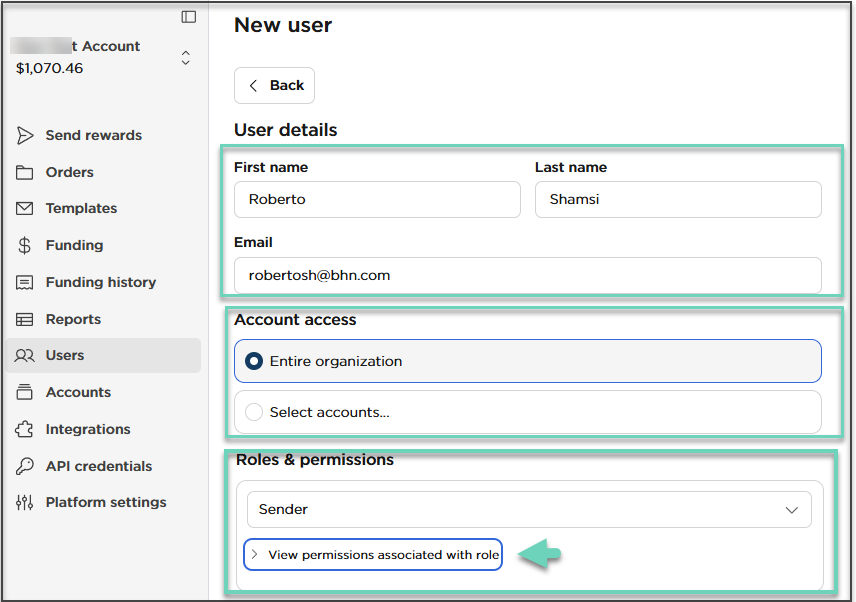 Select a Role such as Sender. To create a custom role, see Manage custom user roles in Tango. For more on default roles, see Manage default user roles in Tango.