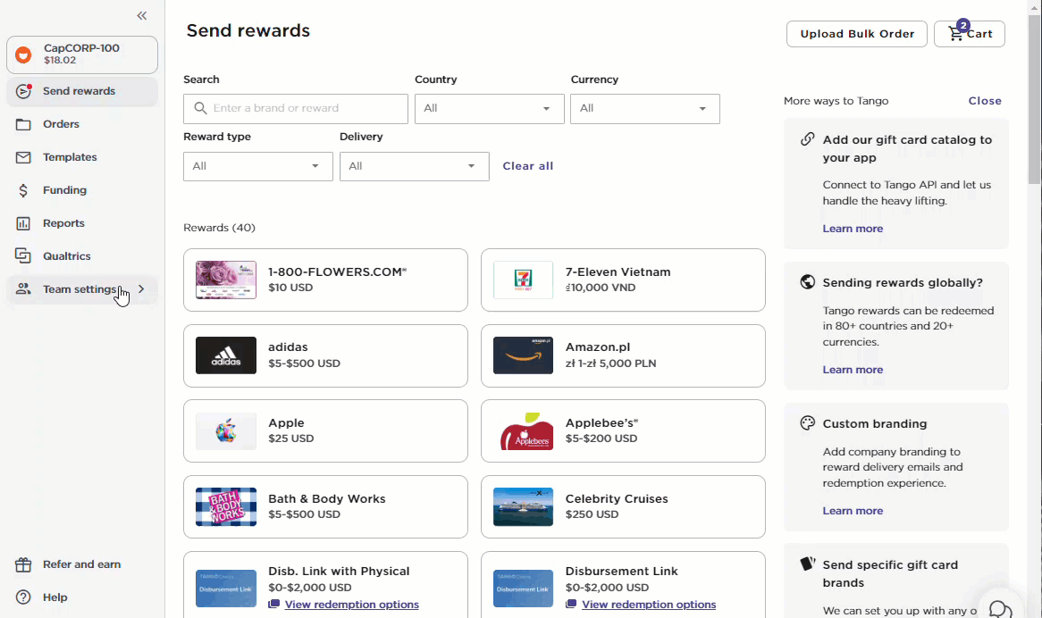 Creating a new Tango account is essential for managing reward distribution, tracking balances, and organizing teams or departments. With an account, you can assign budgets to specific teams, monitor spending, set currency preferences, and enable balance alerts.