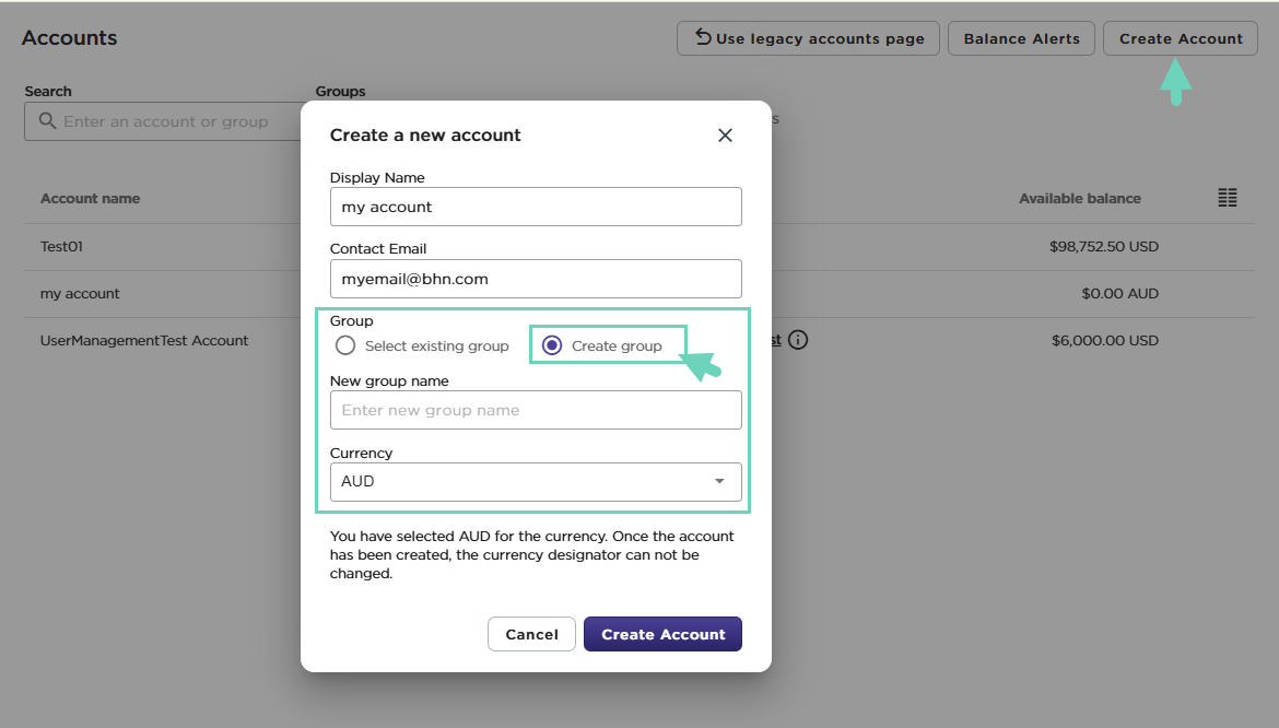 - Group and Account names can contain spaces, hyphens, letters, and numbers. Names must have 5–100 characters.