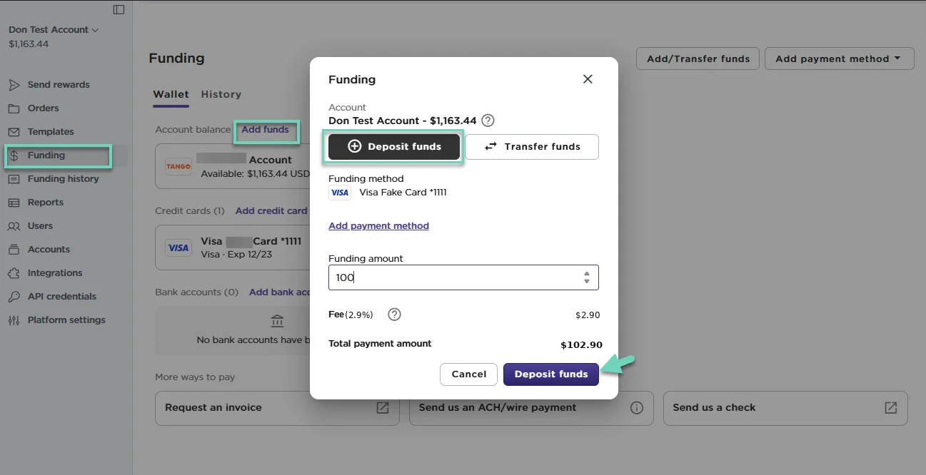 Default credit card funding limits apply to each credit card account on your platform. Other funding methods, such as Wire, ACH, or checks, have no funding limits. Contact your Customer Success Manager (CSM) or success@tangocard.com for details.