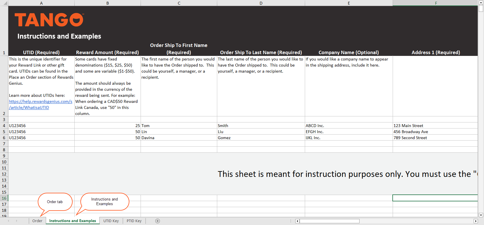 | | Reward Amount | Required | Some cards have fixed denominations ($15, $25, $50) and some are variable ($1-$50). The amount should always be provided in the currency of the reward being sent. For example: When ordering a CAD$50 Reward Link Canada, use "50" in this column. | | Order Ship to First Name | Required | The first name of the person you would like to have the order shipped to. This could be yourself, a manager, or a recipient. | | Order Ship to Last Name | Required | The last name of the person you would like to have the order shipped to. This could be yourself, a manager, or a recipient. | | Company Name | Optional | If you would like a company name to appear in the shipping address, include it here. | | Address 1 | Required | Street address. | | Address 2 | Optional | Secondary address information, such as numbers for apartments, suites, PO Boxes, and other address designators. | | City | Required | City of reward destination. | | State | Required | State of the reward destination. | | Zip | Required | Zip code of the reward destination. | | Message | Optional | A custom message to deliver to your reward recipient. | | From Name | Optional | To notify the recipient who the reward is from. | | To Name | Optional | Name of reward recipient. | | Customer Notes | | This column can be used for internal tracking information, such as employee ID or department number. It shows up on your rewards report, but not on the actual reward. The customer notes are not visible for the recipients. | | PTID | Optional |