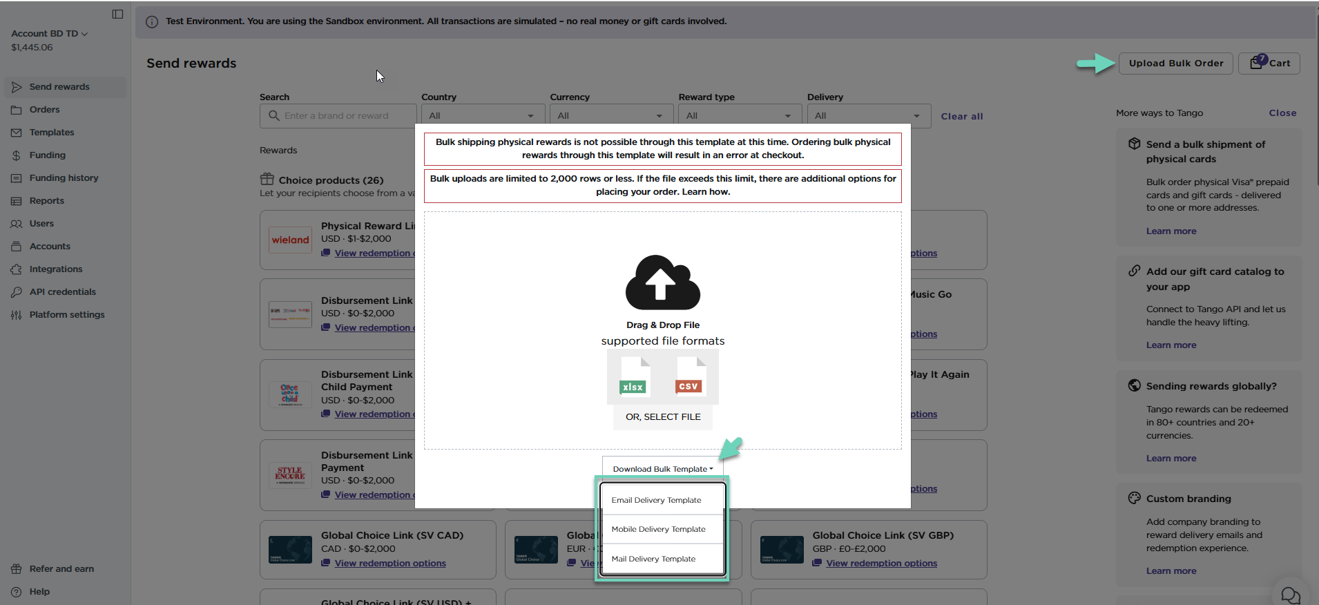 Now that you have created the bulk order file and saved it on your device, upload the file in Tango portal before proceeding to the checkout.