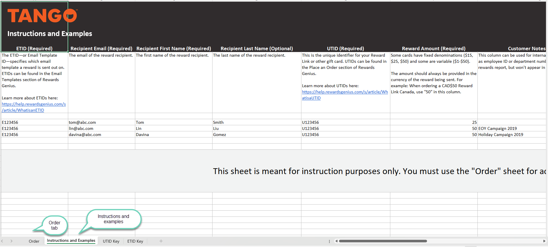 For large orders (bulk digital and bulk Printed Reward Link® ), you can upload a spreadsheet—easily copied from your organization's reports or recipient lists. For small orders (fewer than 15 recipients), it's best to send rewards individually. See how you can Send digital rewards with Tango via email or text. See how you can Send Printed Reward Links with Tango via mail.
