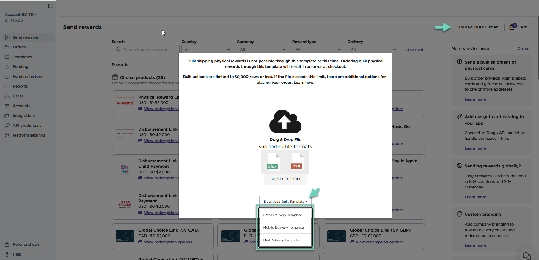 Did you know you can send bulk rewards to up to 50,000 recipients in single order using Tango? We offer dedicated bulk upload templates for email, mobile, and mail delivery to suit your needs.