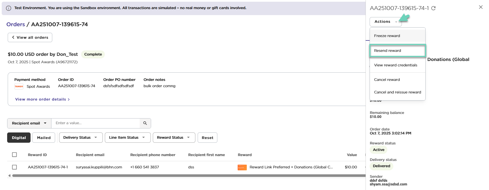 You cannot change the brand, value, or message of a reward after sending it. However, if you have Manage permissions for Order History, you can resend rewards to a different email address of the original recipient from the Orders or Line Items view in the Tango portal. See how you can Manage custom user roles in Tango.