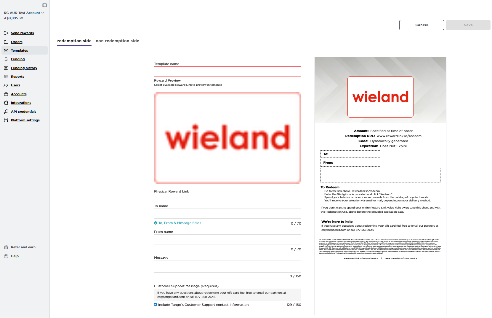 Personalize your printed Reward Link template by adding your company logo, a custom card image, and a tailored message. You cannot set a newly created Printed Reward Link template as the default for your platform, account, or group.