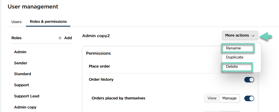 Your duplicated role now appears under Roles & permissions and is ready to assign to users. You can rename, duplicate, or delete this duplicated role.