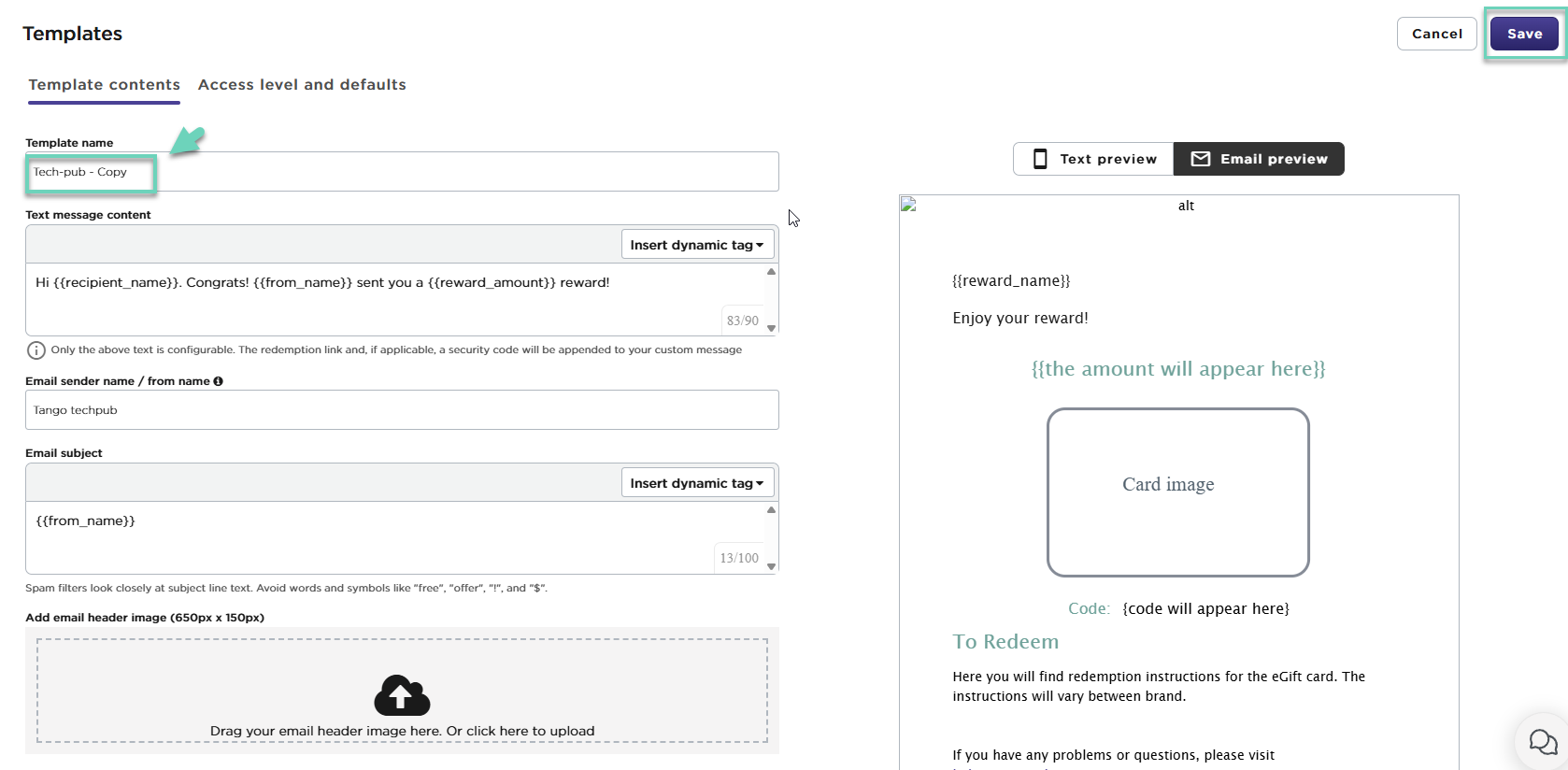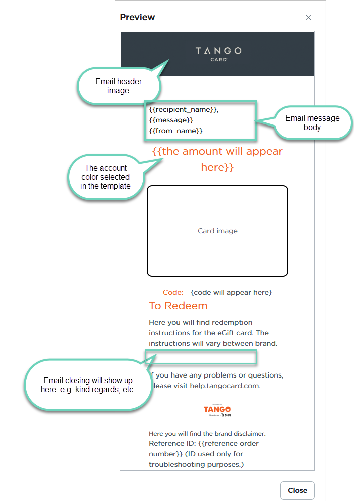 Select preview to see how your email template will appear to recipients. The preview displays dynamic tags, but it does not populate them with actual values as they would appear in a live reward email.