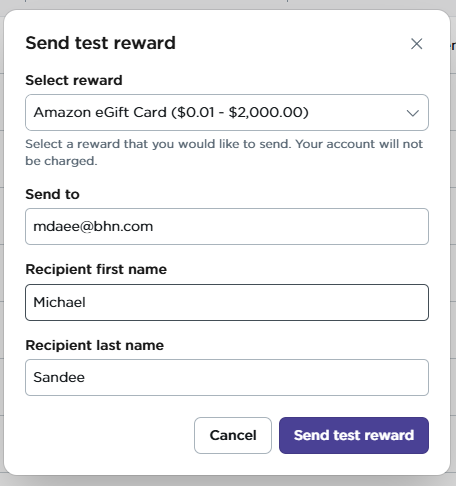 Before sending rewards using your new email template, it’s recommended to send a test email to yourself. The email address is auto-filled, and you can select a reward and manually enter the recipient’s first and last name. It allows you to preview exactly how the email will appear to recipients when rewards are delivered.