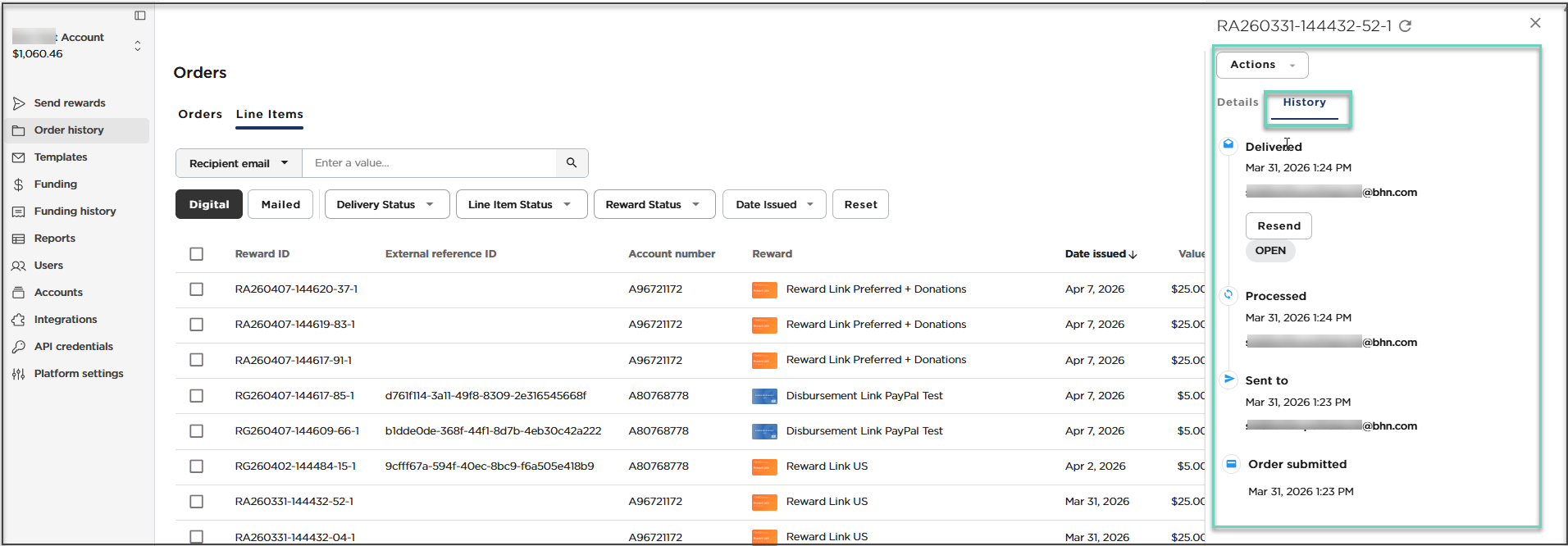 To view redemption history details, go to Order history then click the Orders or Line Items page. To resend an undelivered reward go to the History tab and click Resend. See how you can Resend rewards.