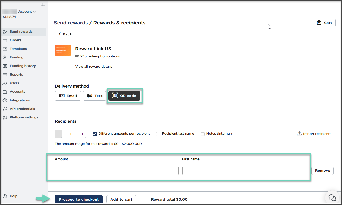 Enter the reward Amount and recipient First name. Last name and internal notes are optional. No contact info is required for QR code delivery.