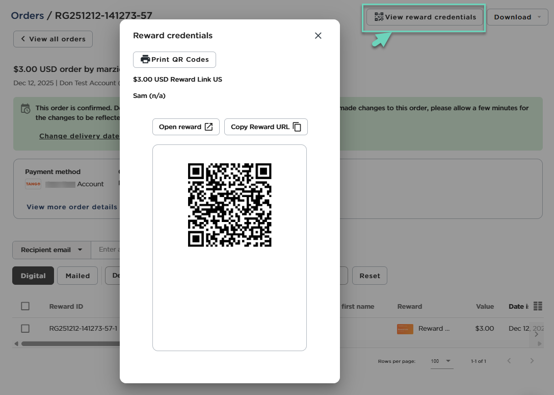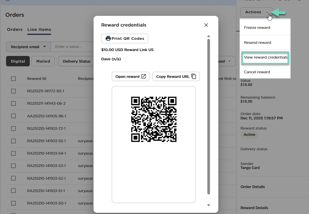 To view and manage the QR code for your sent reward in the Tango portal, follow these steps: