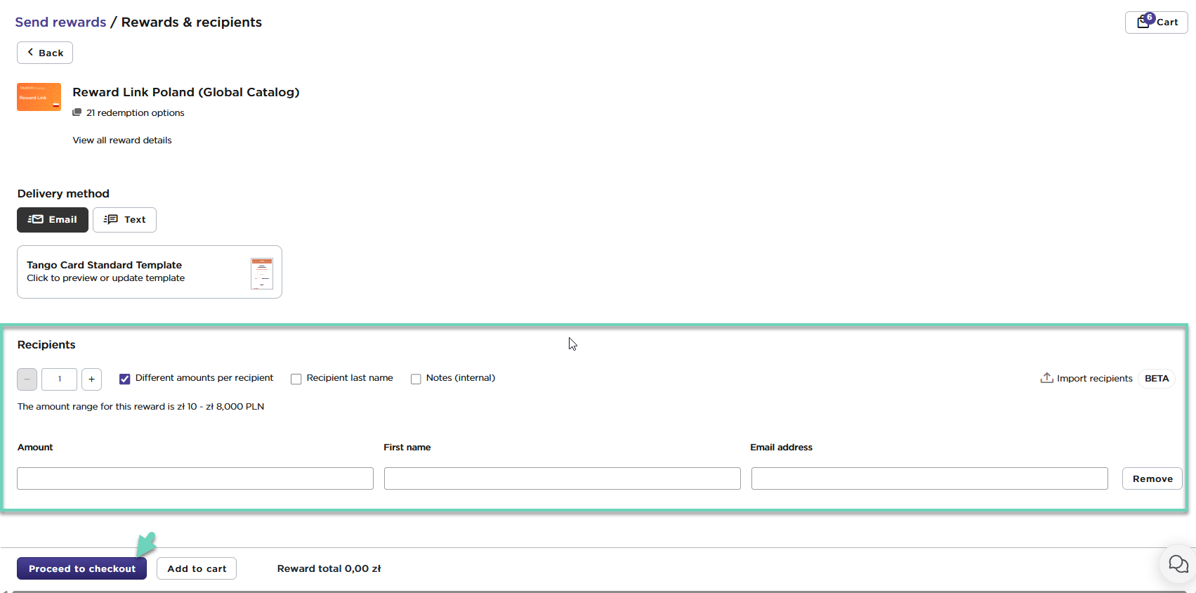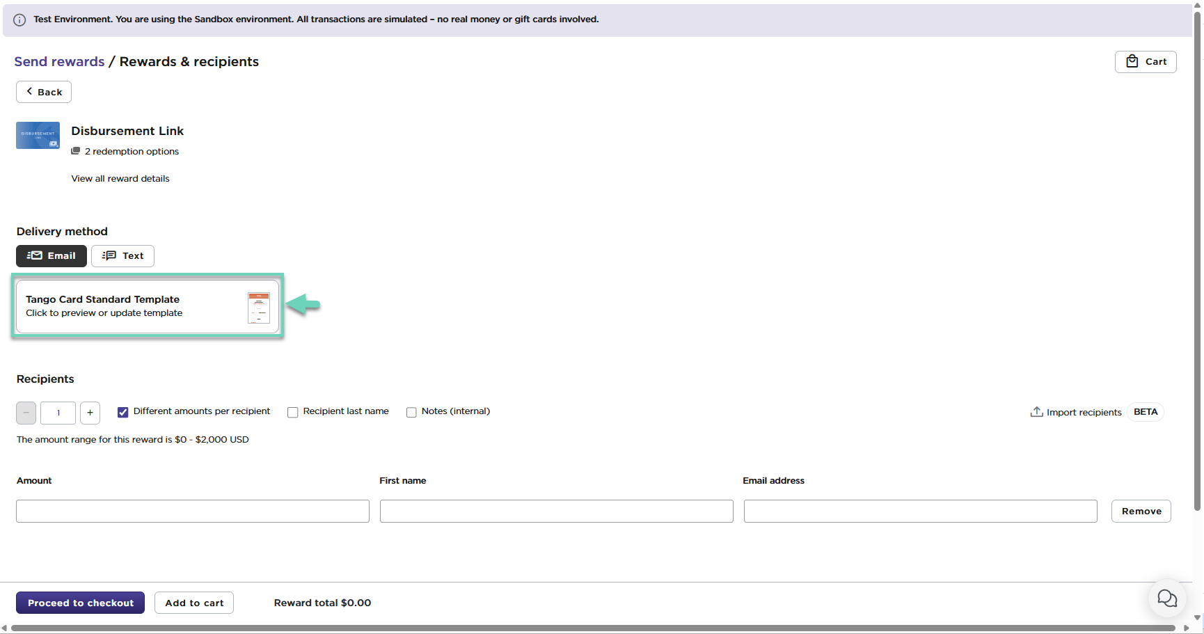 If you want to send rewards to more than 15 recipients in a single order, see Send rewards in bulk. For Printed Reward Link® and physical delivery, see Send Printed Reward Links with Tango.