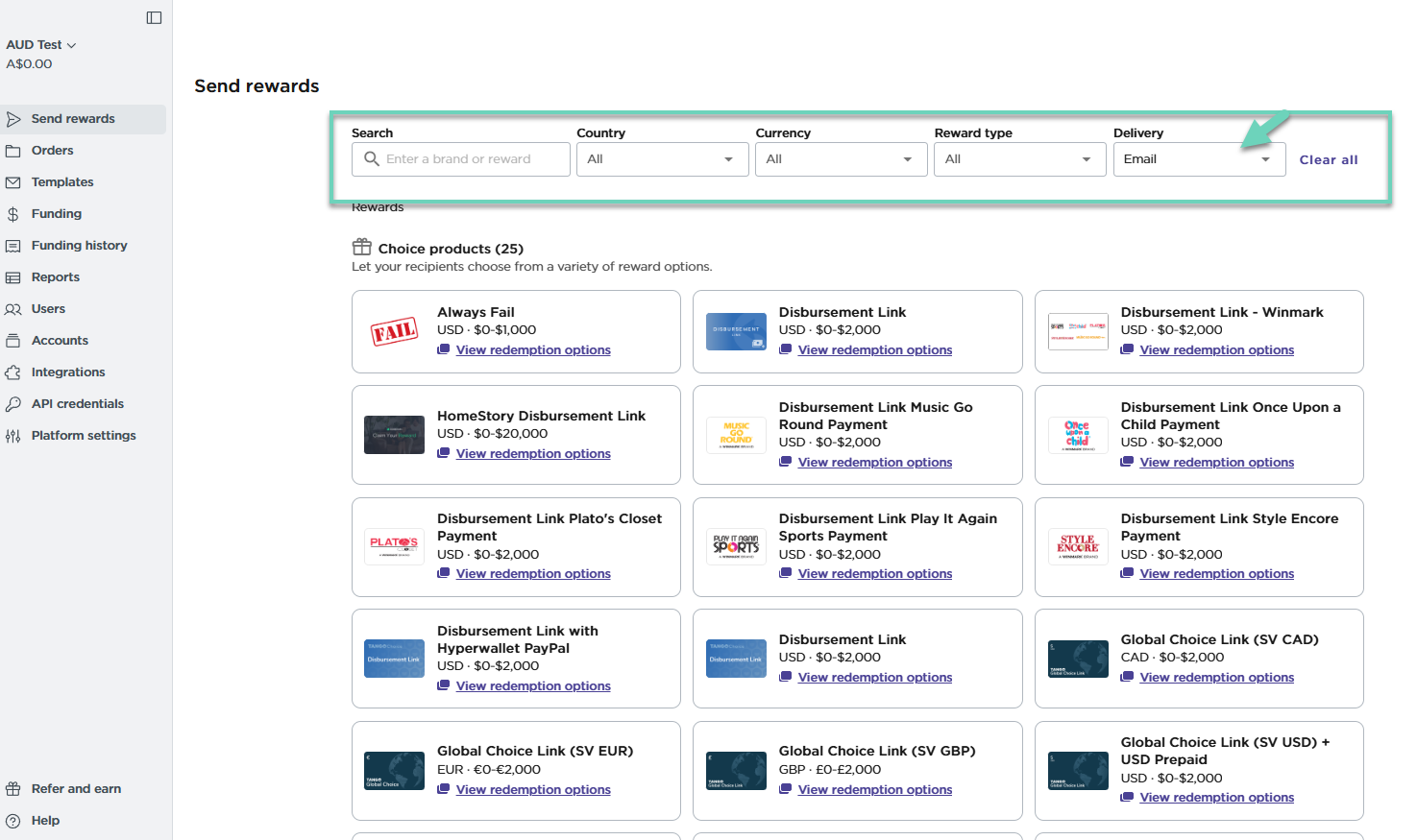 - Narrow down your search. Setting the delivery filter to email, filters out any physically mailed rewards.
