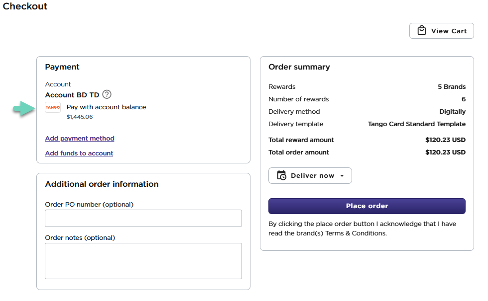 When you are ready to check out, go to the cart and pay for the reward. Place your order by following these steps: