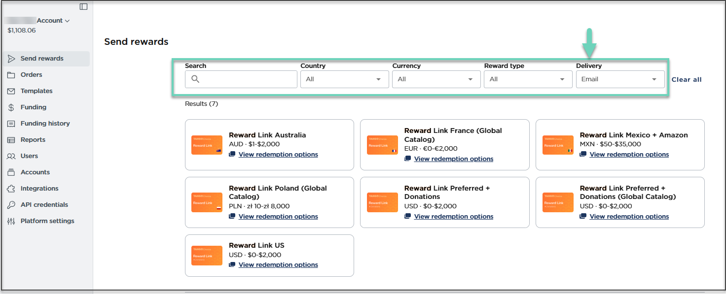 For rewards with multiple redemption options (such as Reward Link®), click View redemption options to preview available brands. Search and filter your reward catalog.
