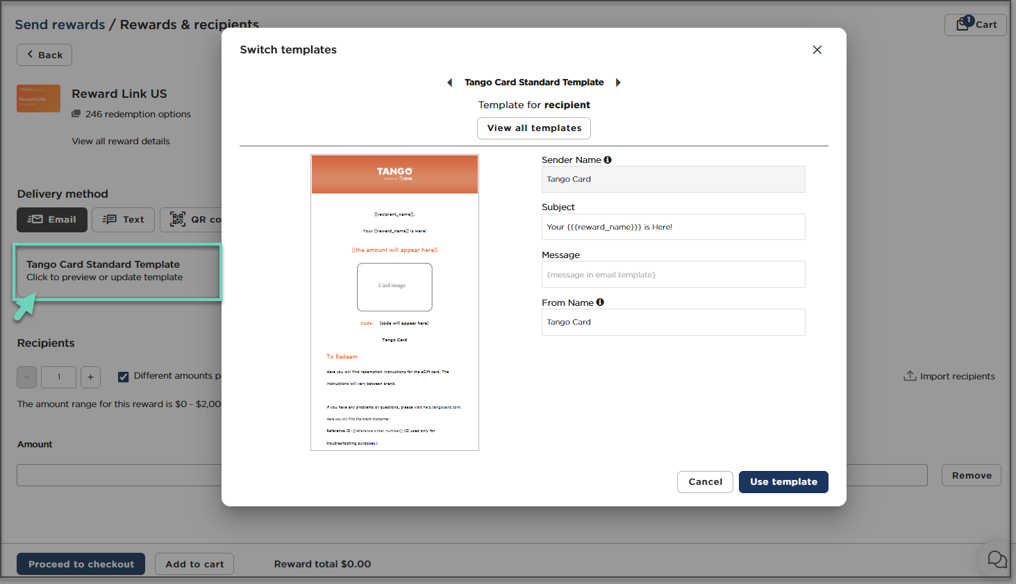 Review your changes in the preview pane and click Use template. The template you select here applies to all recipients added before clicking Proceed to checkout or Add to cart. You can further customize templates for individual rewards from the cart before finalizing your order. For more information on personalized message and also for advanced customization, such as editing the subject line or sender name, see Send personalized messages with digital rewards.