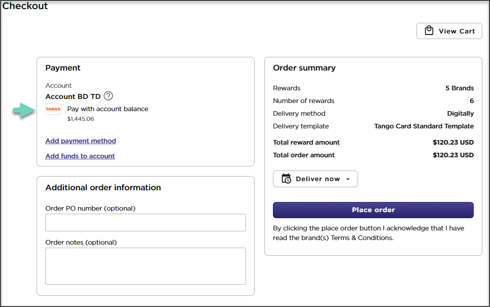 In the Checkout page, make sure you’ve selected the correct Tango Account and payment method.