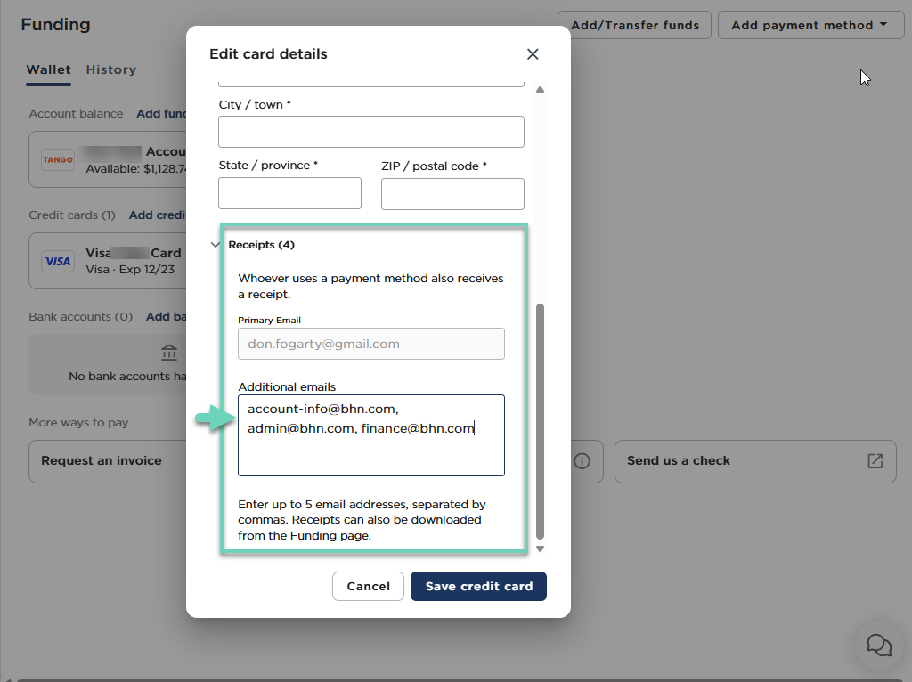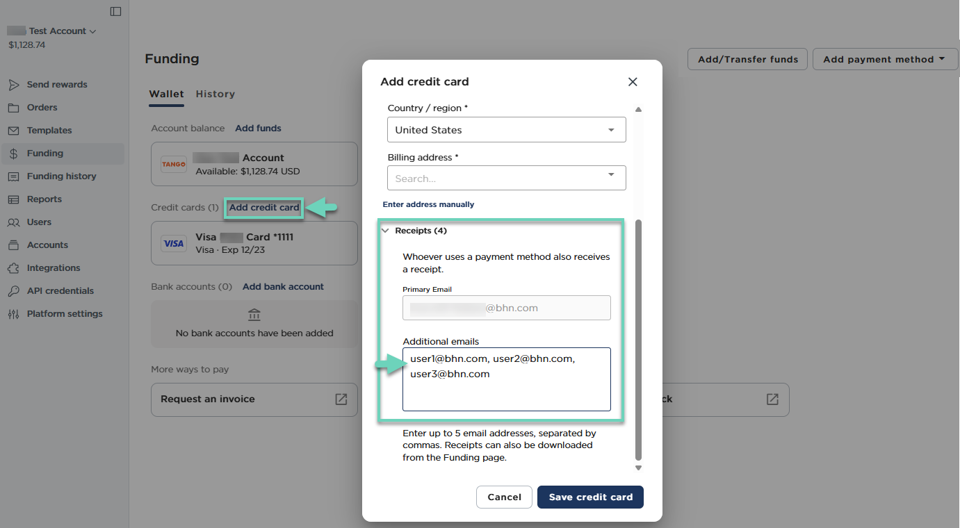 You can get notified anytime a credit card is used to pay for an order or pre-fund an account. Set or edit up to six recipients to receive credit card email notifications when registering a new credit card with Tango. See how to Register credit cards.