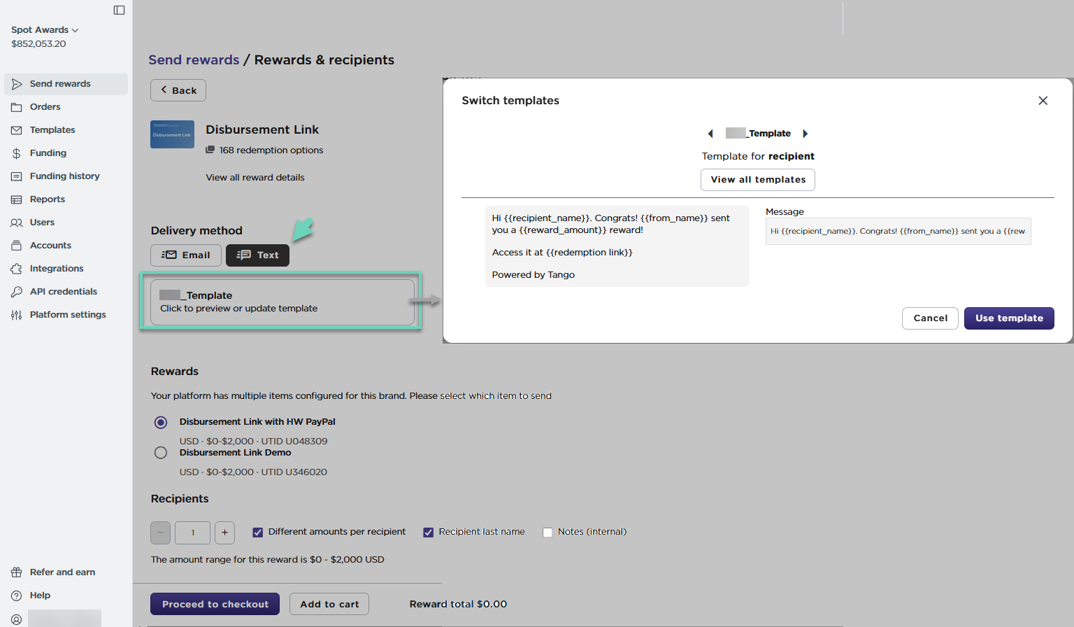 Tango allows you to switch delivery methods to resend rewards as needed. If a reward is eligible for text delivery, you can simply choose Action > Resend reward, then select Text, even if it was originally sent via email delivery. See our instructions in Resend rewards.