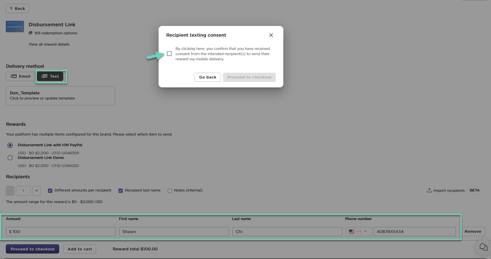 Select the checkmark in Recipient texting consent and click Proceed to checkout. This confirms you have consent from the recipient to send their reward via mobile delivery.