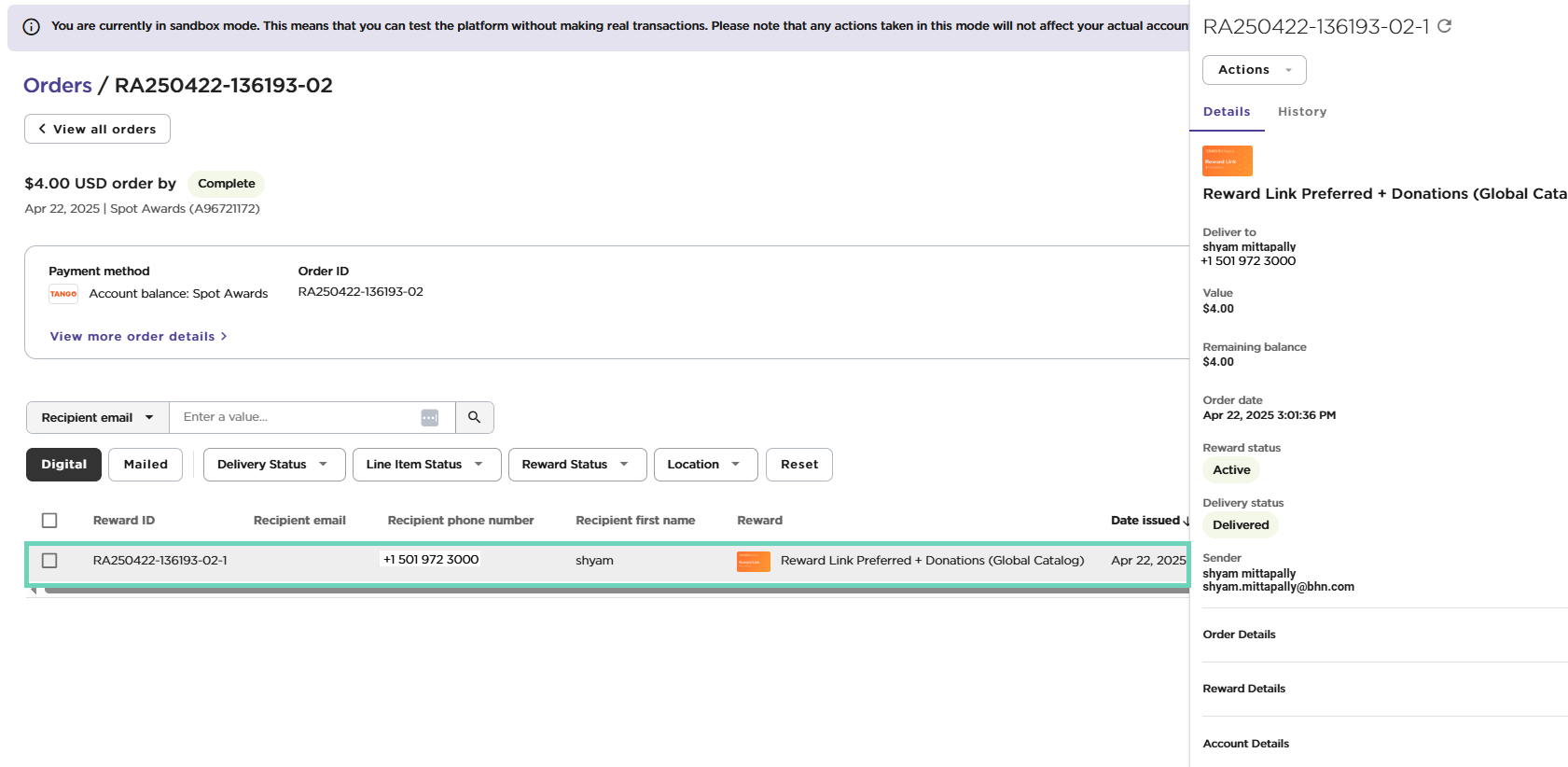 You can see the history and details of rewards sent via text delivery. The recipient phone number for each reward appears under Orders and Line Items: