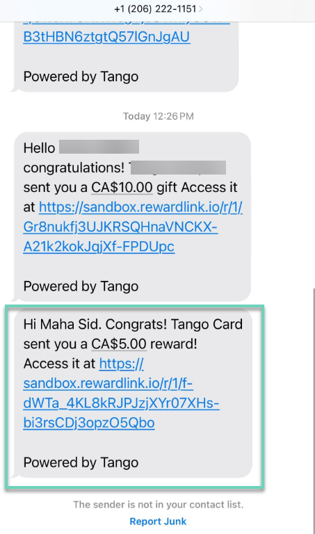 Tango supports mobile reward delivery, allowing you to send digital rewards directly to mobile recipients via text message (to their U.S. or Canadian mobile numbers). To use text for delivery, you must enable mobile reward delivery for your platform. See Enable mobile reward delivery.