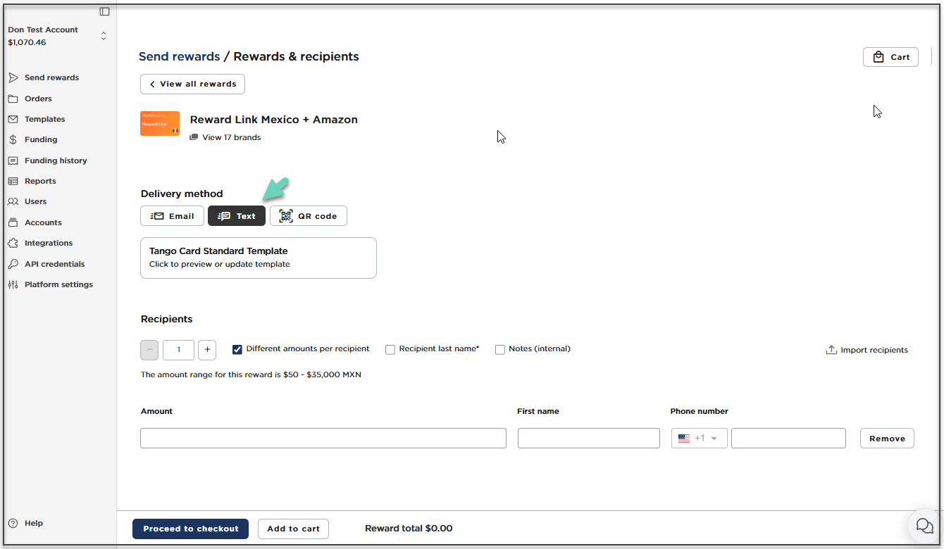 Not all rewards support text delivery. The Tango unique template ID (UTID) must specify the delivery method above. If a reward is ineligible, Text is disabled on the Send rewards page.