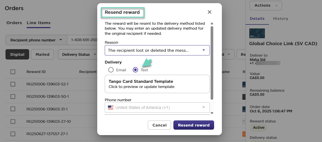 Tango allows you to switch delivery methods to resend rewards as needed. If a reward is eligible for text delivery, you can simply choose Action > Resend reward, then select Text, even if it was originally sent via email delivery.