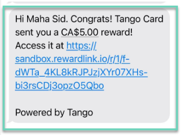 After you place the order, the recipient gets a text message from a Tango phone number with the reward amount and a URL to redeem. Here's an example: