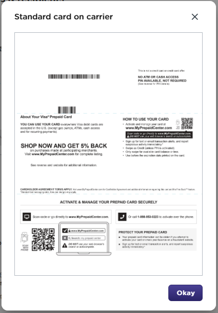 - Click to preview the Standard Card on carrier. All cards are shipped with a standard card carrier by default. Click Okay to exist.
