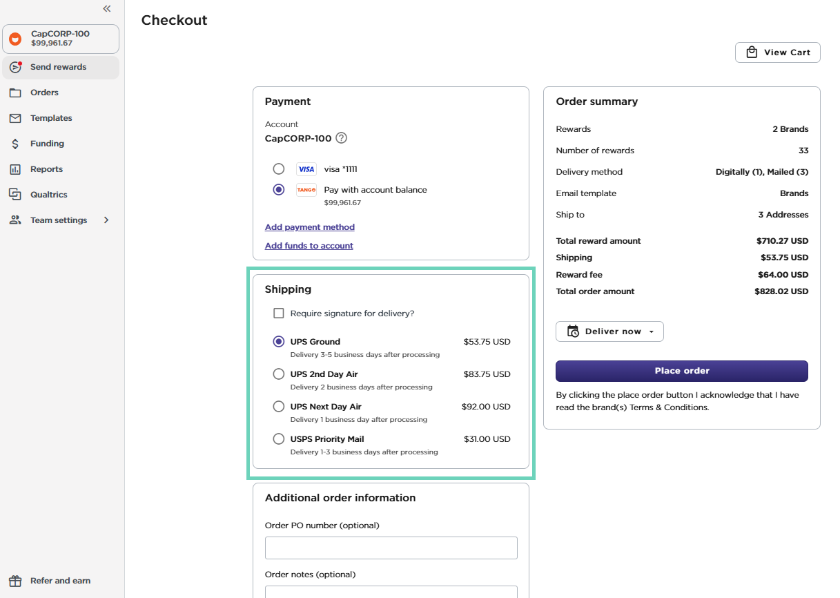 Click a tracking number to view detailed information about your order’s delivery status. You can also see the order date, payment method, and PO number (if entered). To learn how to manage reward orders, see Manage reward orders with Tango.
