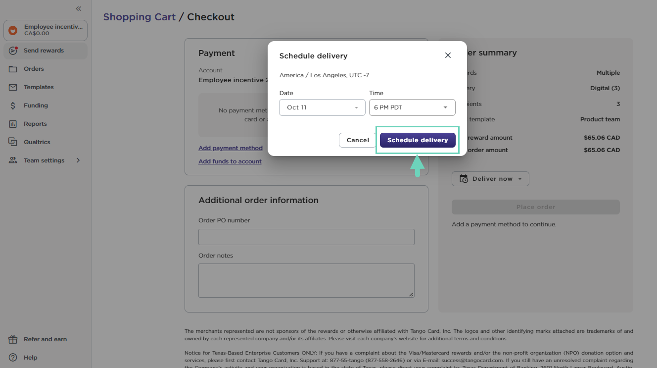 The order is complete, and you have been charged for the scheduled delivery. The status of this line item appears on the Orders page. The line item status appears on the Orders page and under the order history. See Order, reward, and email statuses in Tango. For complete instructions, see Send digital rewards with Tango. To edit or delete items in the cart, see Edit or delete items in the cart.